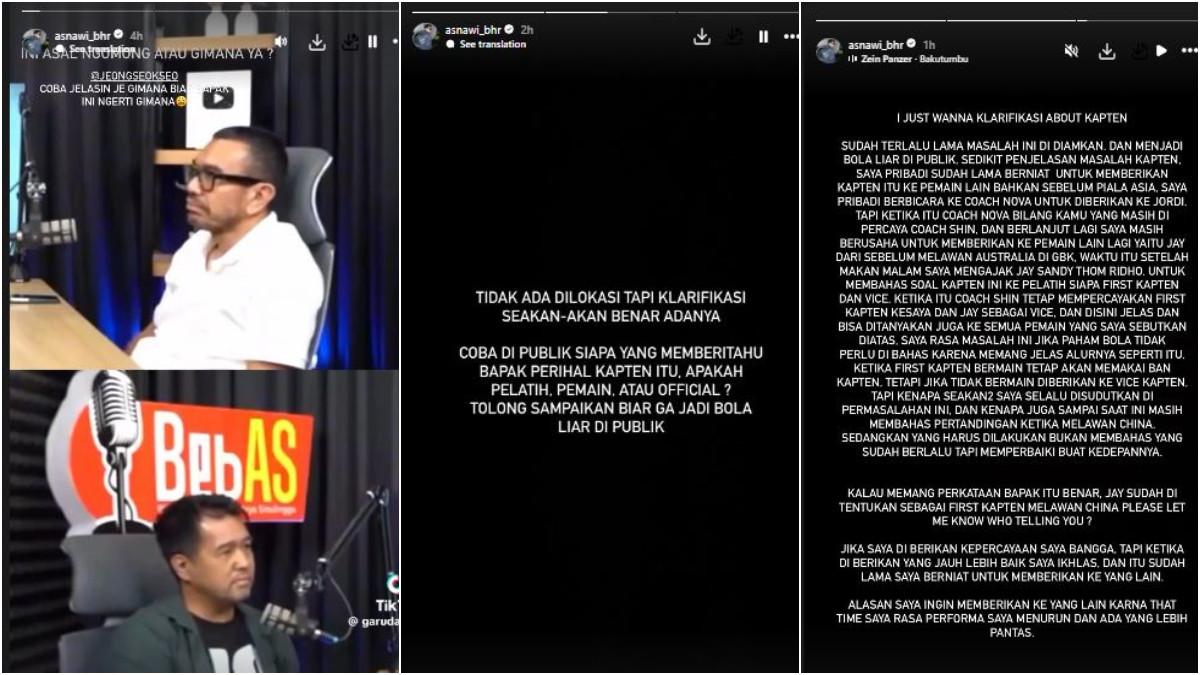 Sebelum memberikan klarifikasi resmi, Asnawi mengunggah sebuah cuplikan video dari podcast Arya Sinulingga dan Bung Harpa yang membahas isu internal dan pemilihan kapten saat laga melawan China. Dengan nada sarkas, Asnawi menandai akun Jeje dalam unggahannya, seolah meminta klarifikasi dari rekannya tersebut.